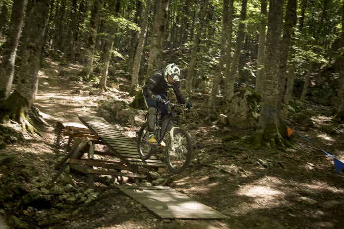 斜面を駆け下りるように走行するダウンヒル。駆け下りながら、時にはジャンプする事もあるため、自転車への衝撃がとても大きい走り方です。