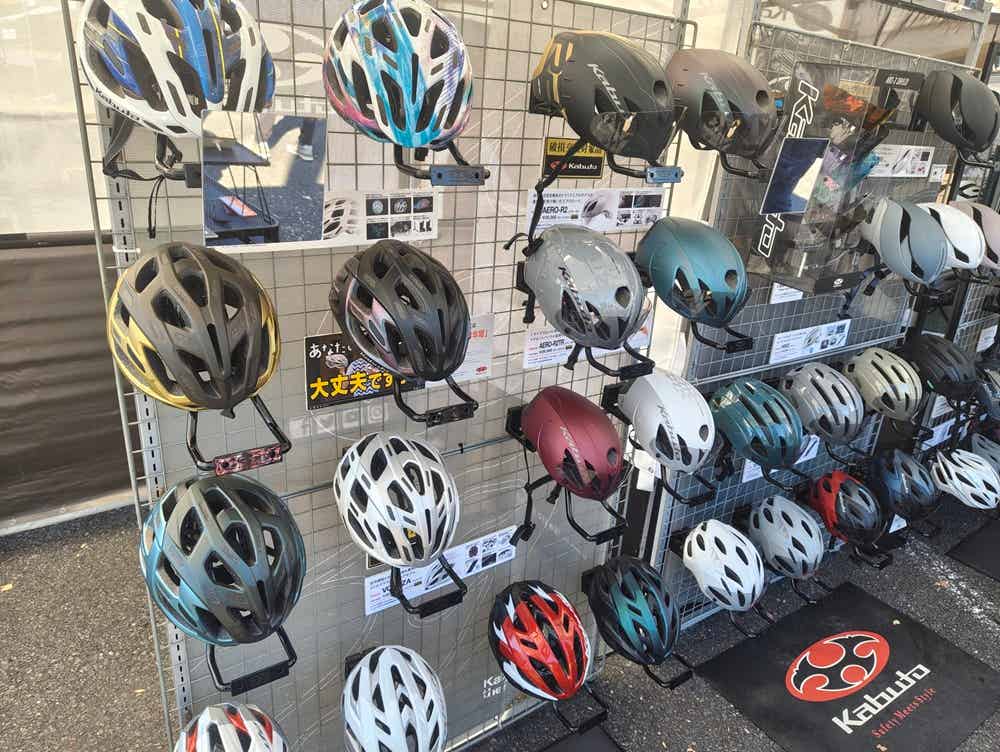 オージーケーカブトブースでは、本格的なロード向けから街乗り向けまで、いろいろなヘルメットを試着できます。
