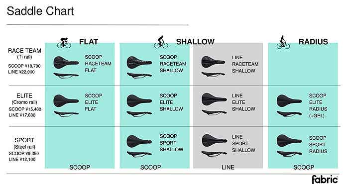 ラインナップは、前傾姿勢の強さに合わせて選べる「Flat(フラット)」「Shallow(シャロー)」「Radius(ラディウス)」の3タイプを展開。フラッグシップの「SCOOP」をはじめ、中央に溝を設けた「LINE」、トライアスロン向けの「TRI」など、ライダーのスタイルに合わせたサドルを選ぶことができます。