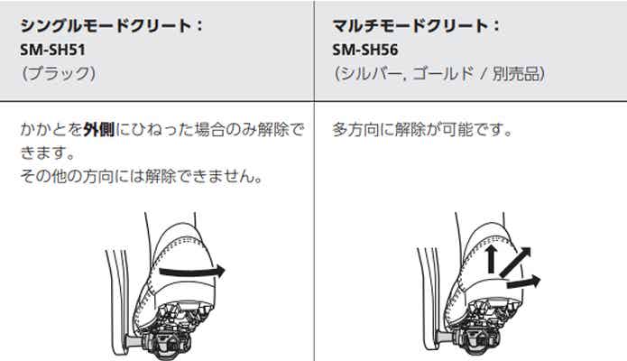 SPDペダルのクリートは2種類あり、違いをご紹介します。SPDペダルは購入時にクリートが付属してきますが、シングルモードクリート(型番:SM-SH51)とマルチモードクリート(型番:SM-SH56 )の2つの種類があります。