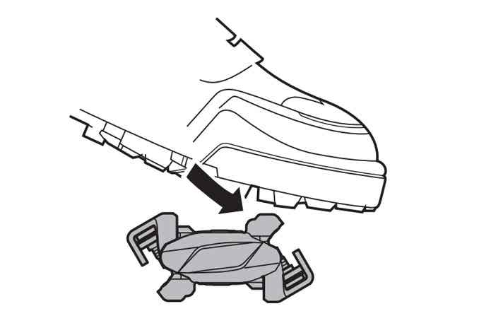 取り付け方は、クリートをSPDペダル前方の金具に当てるように差しこんだあと、踏み込むと装着できます。