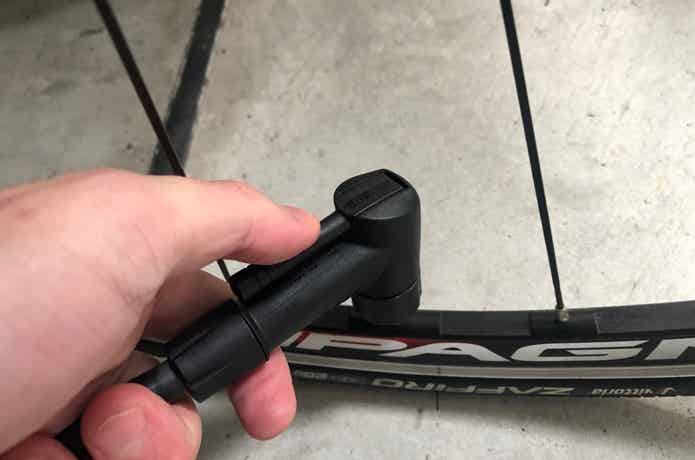 バルブの先端部分を反時計回りに回すと、バルブが緩み、空気が入れられるようになります。バルブは指で容易に回せるため、特に工具は必要ありません。