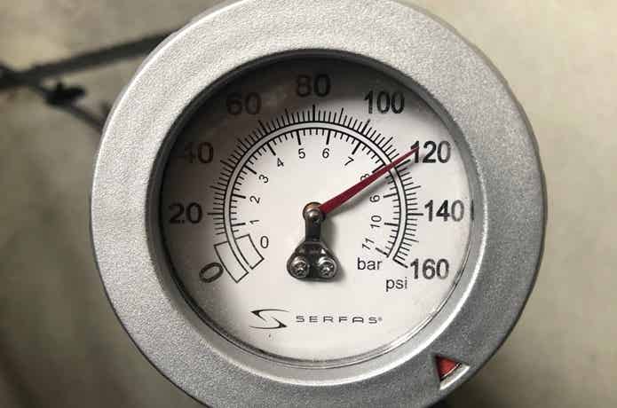 ポンプとバルブが固定された状態で、空気を入れていきます。仏式のバルブに対応した空気入れには空気圧計が付いているので、ポンピングしながら空気圧計を確認し、適正な空気圧になるまで入れましょう。