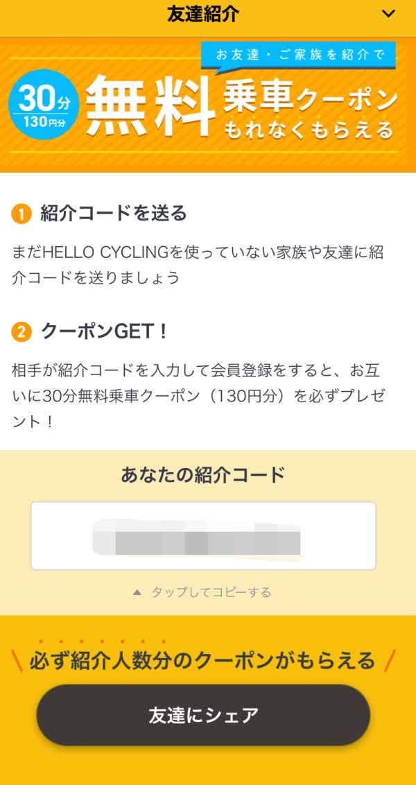アプリをインストールすると30分の無料クーポンがもらえます。また、お友達紹介で、アプリに記載された紹介コードを送った相手が会員登録をすると、両方に30分無料クーポン(130円分)がプレゼントされます。まずはこのクーポンを利用して、使い勝手を確認してみましょう。