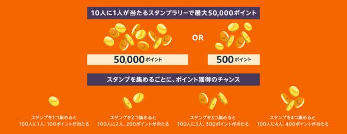 5つのスタンプをすべて集めると、抽選で最大50,000ポイントまたは500ポイントが当たるチャンス。最大50,000ポイントが当たる抽選に応募するには、キャンペーン期間中に対象商品を2,000円以上購入する必要があります。また1つ~4つ集めてもポイントが当たります。