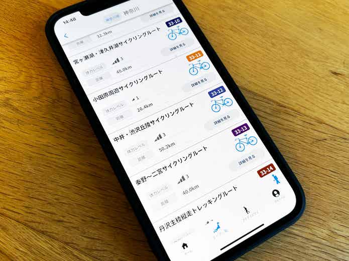 ジャパンエコトラックのルートは、公式サイトやアプリでエリアやアクティビティから検索することができます。神奈川県のサイクリングルートは14種類あり、距離も10km程度から100kmまでさまざまあります。